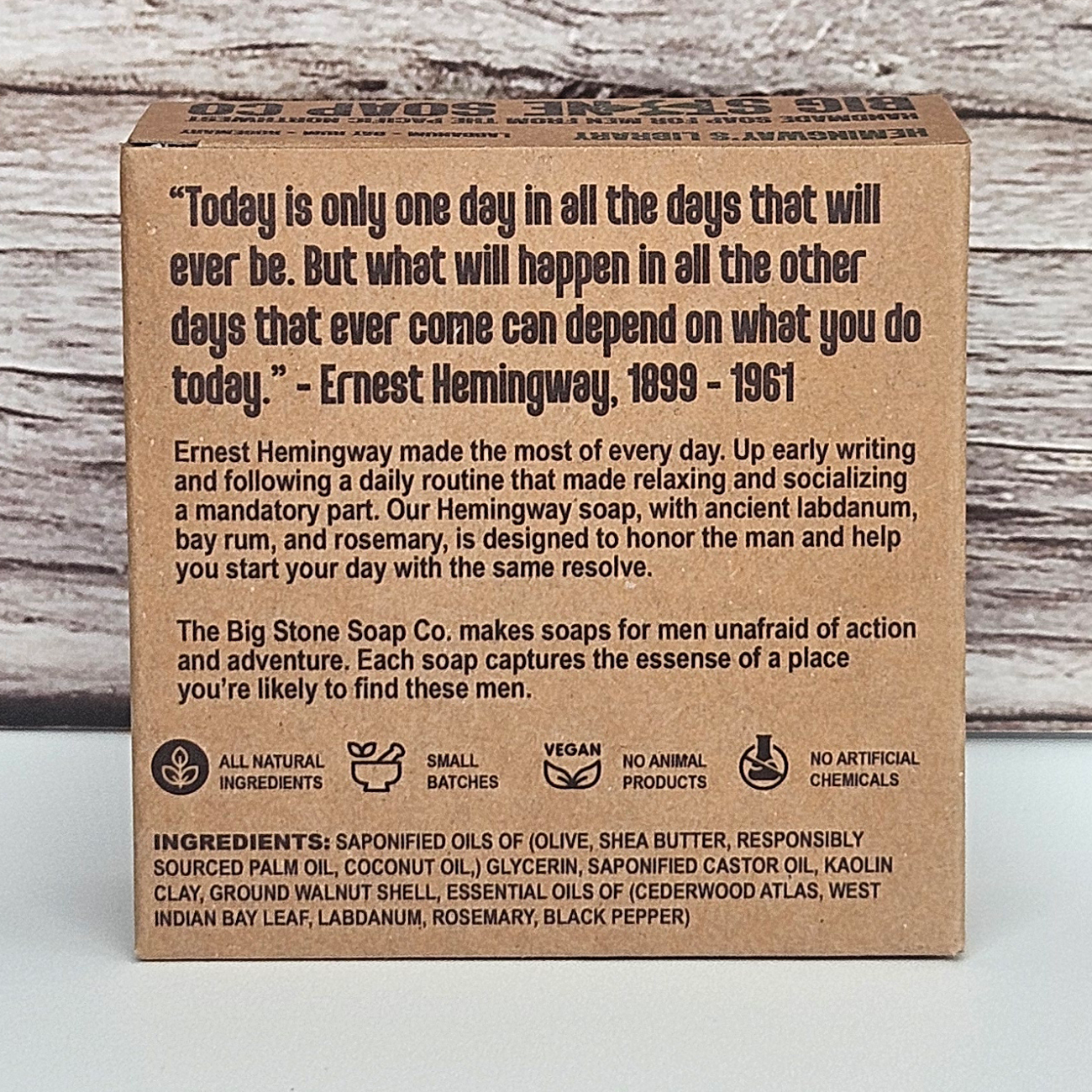 Our Hemingway's Library soap, with ancient labdanum, bay rum, rosemary, and black pepper, is designed to honor the man and help you start your day with the same resolve as the Mr. Hemingway, who was up early writing and following a daily routine that made relaxing and socializing a mandatory part.