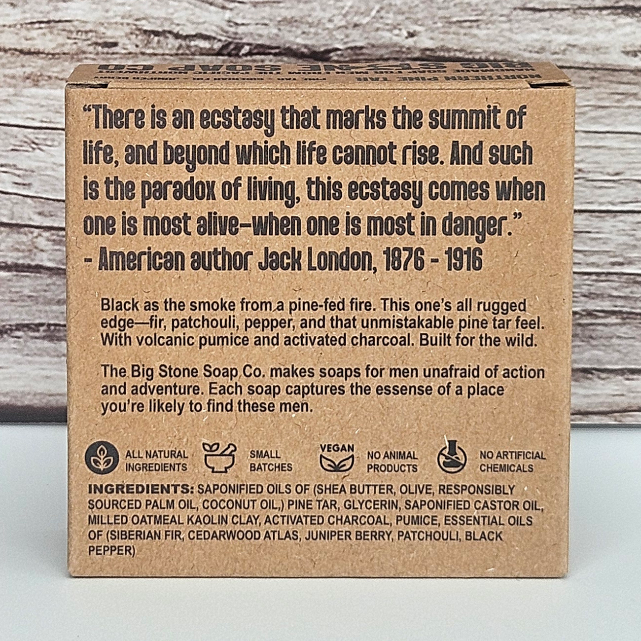 Ingredients: Saponified Oils of (Shea Butter, Olive, Responsibly Sourced Palm, Coconut,) Pine Tar, Glycerin, Saponified Castor Oil, Milled Oatmeal, Kaolin Clay, Activated Charcoal, Pumice, Essential Oils of (Siberian Fir, Cedarwood, Juniper Berry, Patchouli, Black Pepper)
